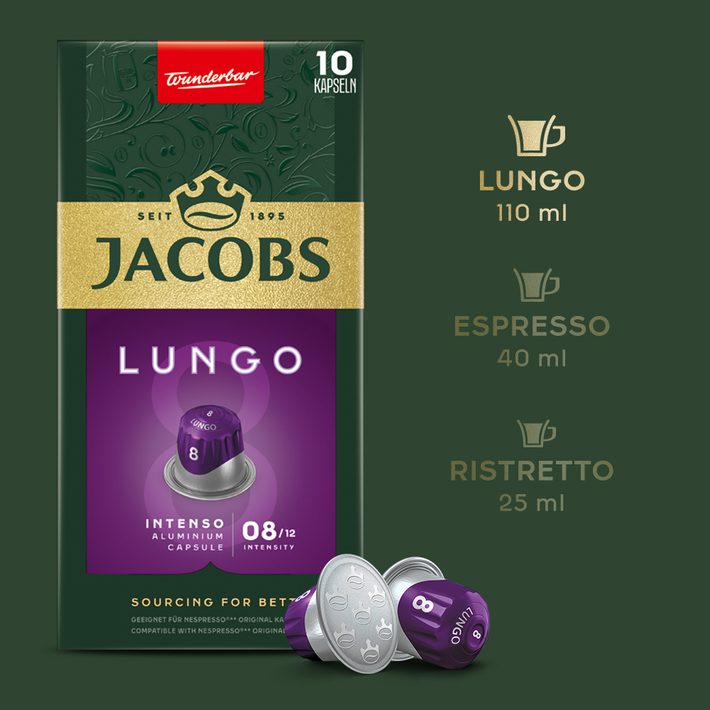 Kapsułki aluminiowe Jacobs Lungo Intenso 10 sztuk, Intensywność 8, kompatybilne z ekspresami Nespresso®*
