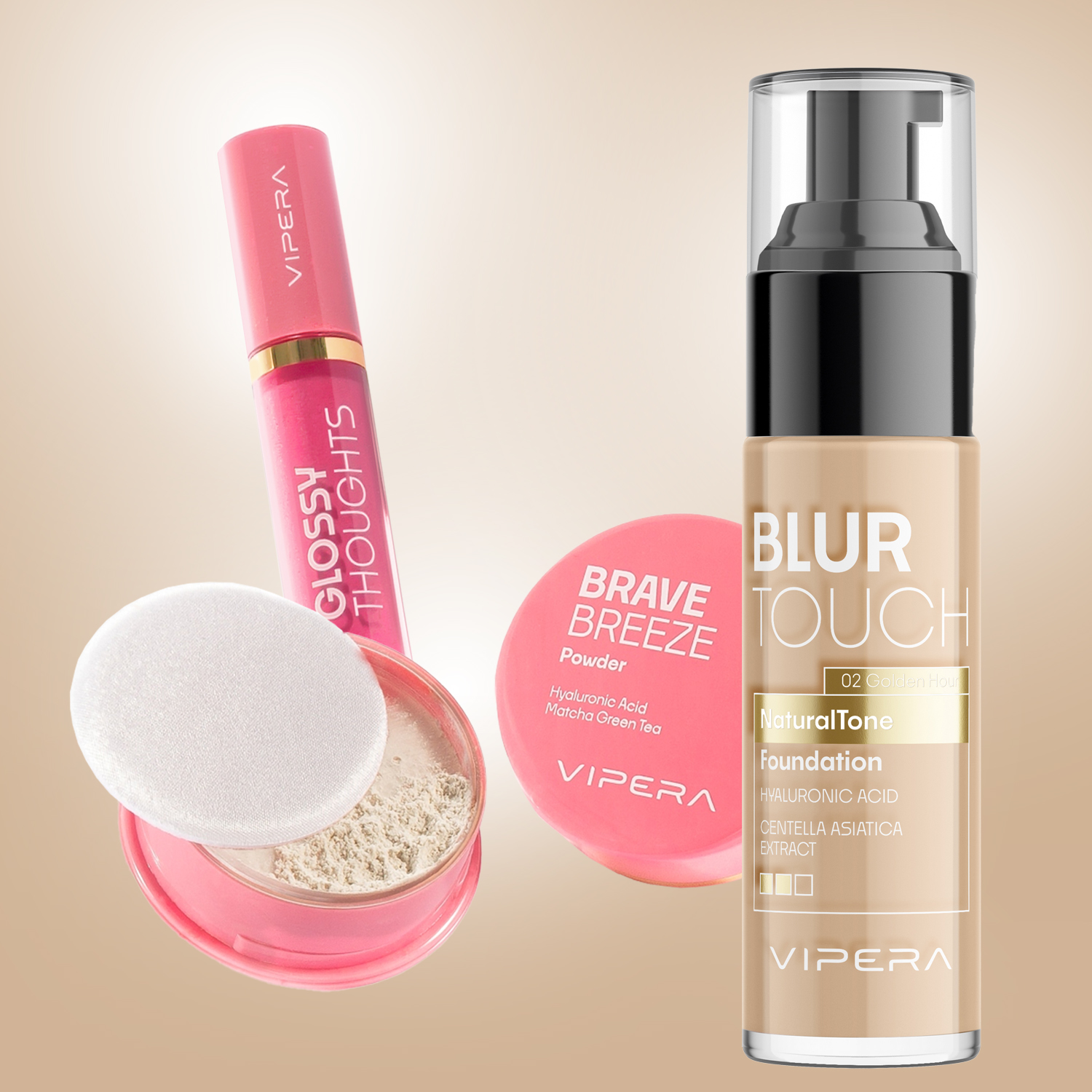 Zestaw Podkład BLUR TOUCH 02 Golden Hour + Błyszczyk 02 Pink Blossom + GRATIS Puder sypki BRAVE BREEZE 00 transparentny 10g