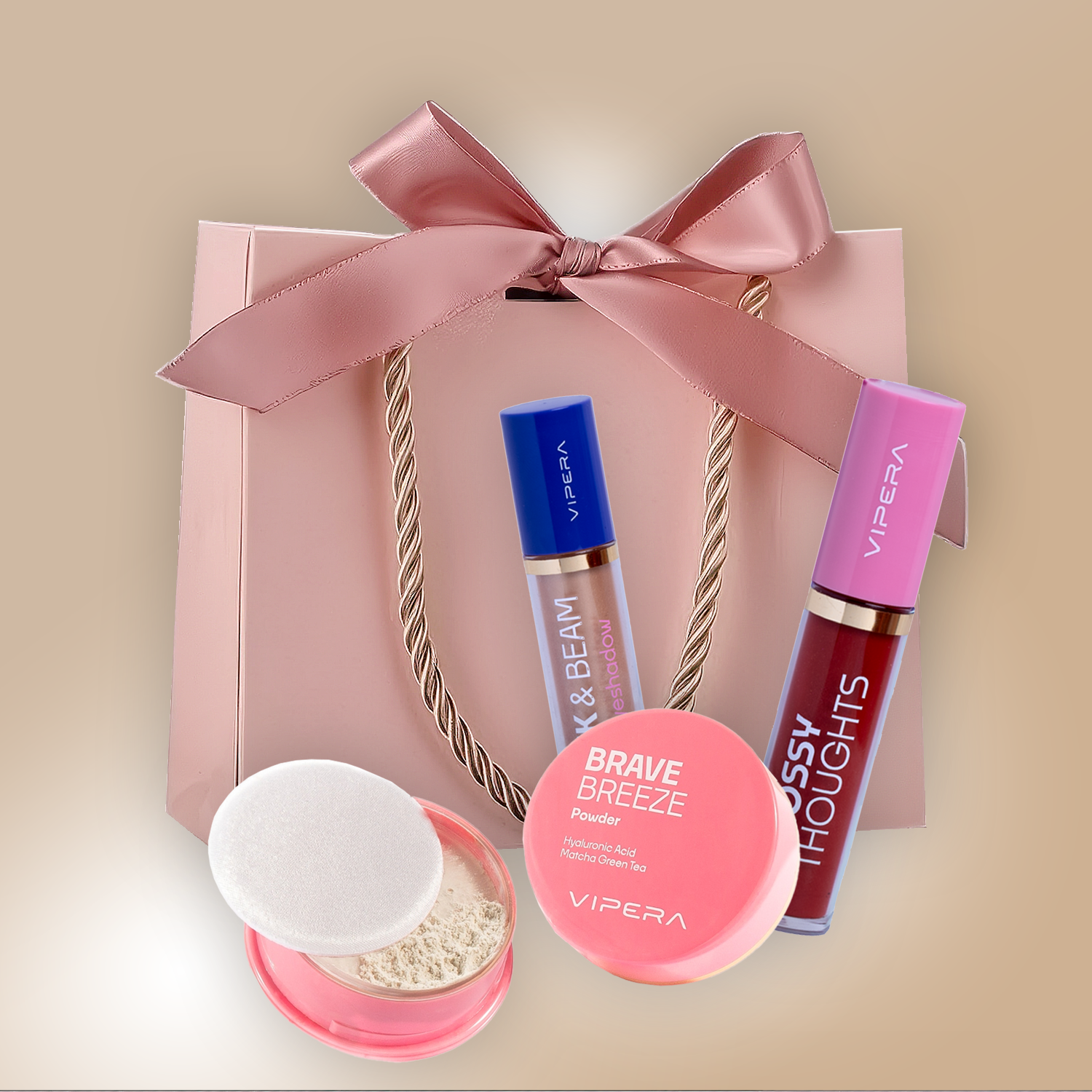 Zestaw VIPERA Cień do powiek BLINK & BEAM 03 Toffee Silk + Błyszczyk GLOSSY THOUGHTS Ruby Red 4,5ml + Puder sypki BRAVE BREEZE 00 transparentny 10g gratis torebka