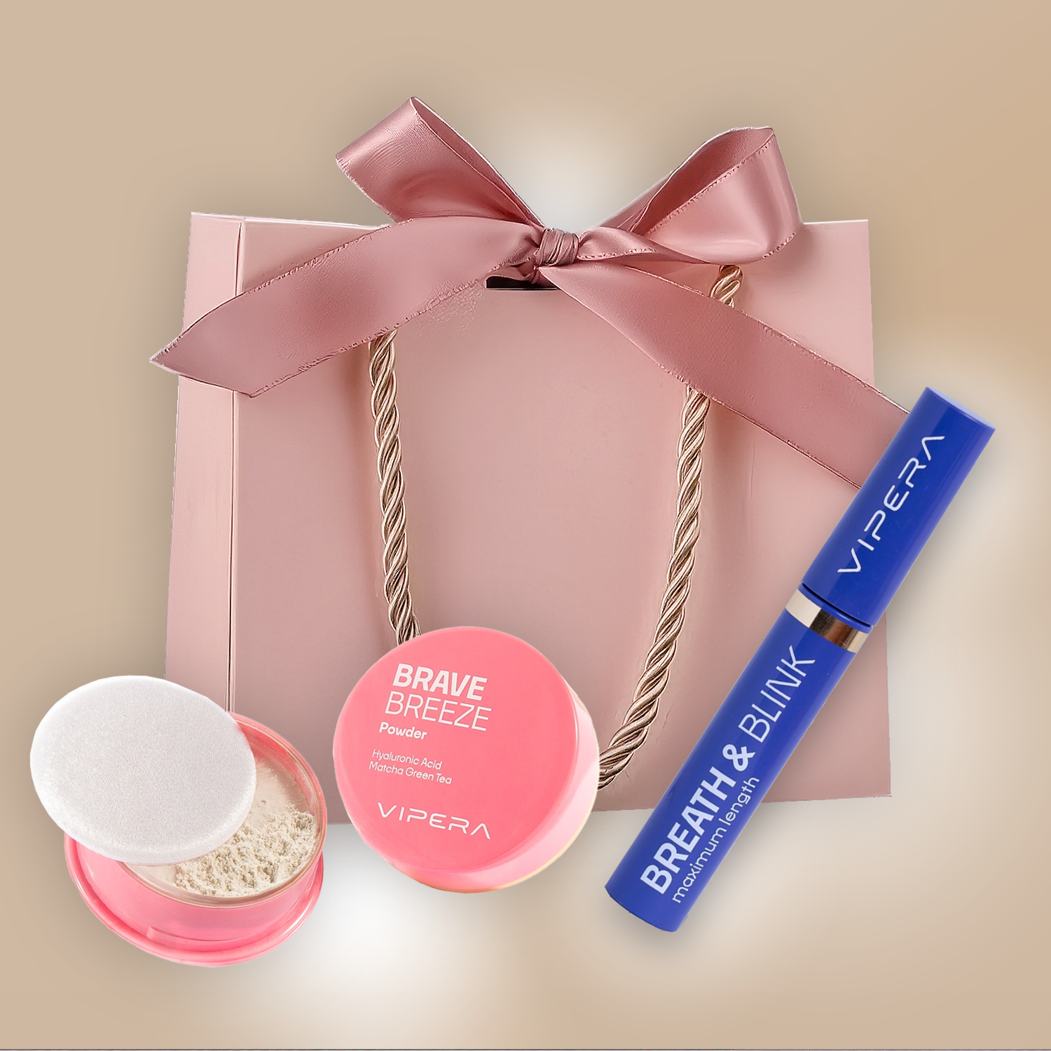 Zestaw VIPERA Puder sypki BRAVE BREEZE 00 transparentny 10g + Maskara BREATH & BLINK maximum lenght 01 Black 12g + gratis torebka