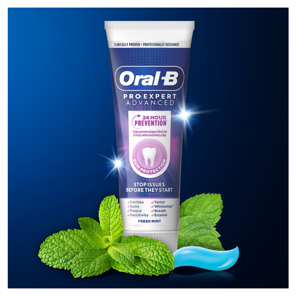 Skuteczność opracowanej przez profesjonalistów pasty do zębów Oral-B Pro-Expert Advanced Gum Protection została dowiedziona klinicznie: zapobiega problemom, zanim się pojawią, i pomaga chronić przed płytką bakteryjną oraz jej przywieraniu do zębów i dziąseł przez 24 godziny przy szczotkowaniu dwa razy dziennie.