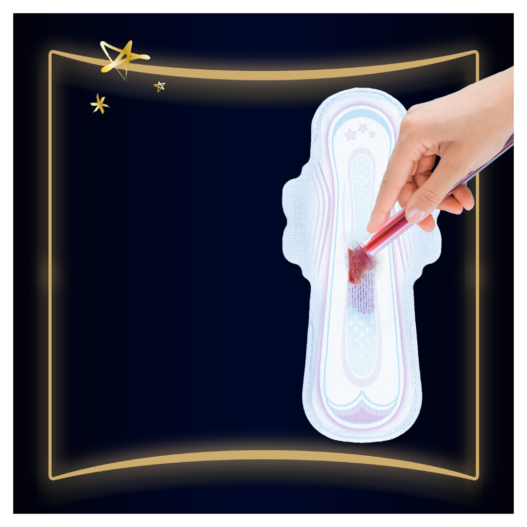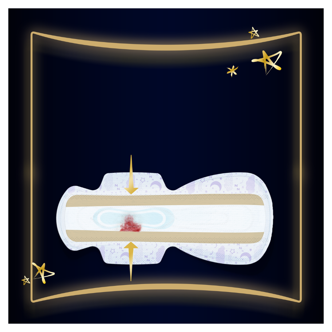 O 9% większy przód i o 85% większy tył* w połączeniu z technologią LeakGuard zapewniają ochronę z każdej strony, zapobiegając przeciekaniu podczas nocnych krwawień. System InstantDry wchłania wilgoć w kilka sekund i utrzymuje ją z dala od Twojej skóry.